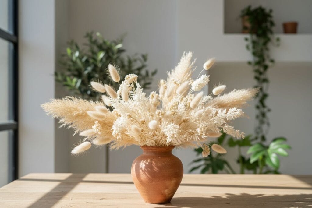 Por exemplo, transforme a sala de estar no coração verde da casa com arranjos volumosos de pampas em vasos de cerâmica portuguesa. Nomeadamente, um centro de mesa combinando pampas Mocha Mousse com eucalipto cria impacto visual imediato. Paralelamente, ramos individuais apresentados em garrafas vintage sobre estantes adicionam charme sustentável. Finalmente, uma coroa de flores secas na parede funciona como arte natural, zero plástico e 100% ecológica.